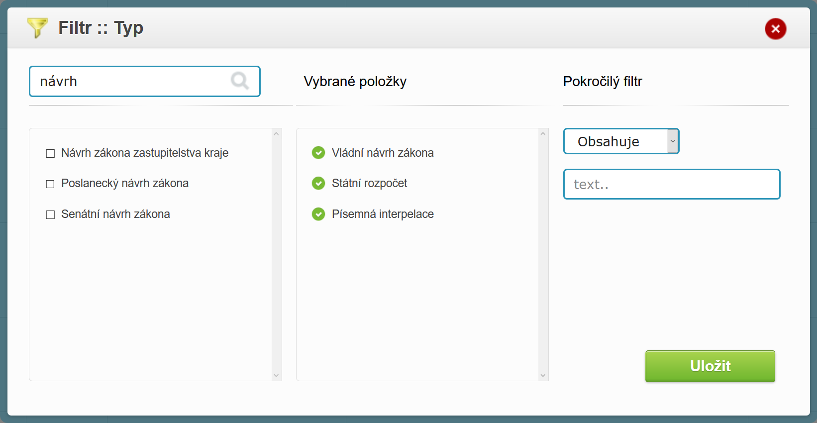 - Pokročilé filtrování záznamů - Ve vybraných sloupcích náhledu je k dispozici ikona Pokročilého filtrování. Tato ikona umožňuje vybrat v detailním náhledu požadované informace s možností násobného výběru tzv. Multiselector (viz obrázek níže). Filtrovat lze křížově mezi jednotlivými sloupci